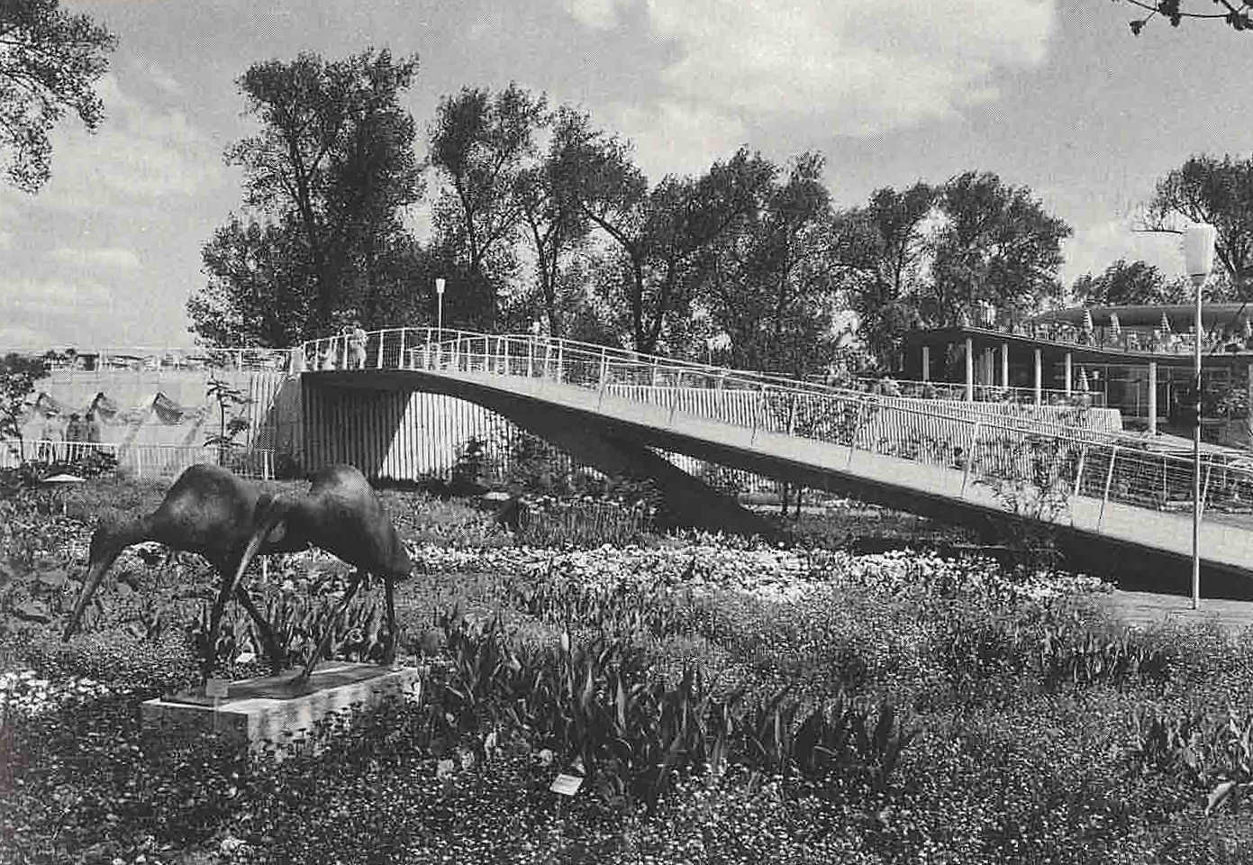 Mit der ersten Bundesgartenschau wurde das durch Trümmerschutt unzugängliche Gelände zwischen Messe und Mülheimer Hafen neu gestalt. In Köln machte sich schon die positive Aufbruchstimmung der deutschen Wirtschaftswunderjahre bemerkbar: Auf dem Geländes des Rheinparks wurden üppige, farbenfrohe Blumenbeete angelegt und Brunnen mit hochschießenden Fontänen errichtet. Rosafarbene Flamingos bevölkerten weitgeschwungene Wasserbecken.