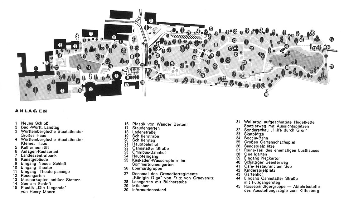 Erstmals stand bei einer Bundesgartenschau nicht länger die Beseitigung von Kriegsschäden im Mittelpunkt: Die Stadt Stuttgart wollte neue, öffentliche Grünflächen schaffen, die dem damaligen Zeitgeist entsprachen. Dazu wurden die 600 Jahre alten Anlagen der Oberen und Mittleren Schlossgärten im Stadtzentrum ausgewählt. Sie wurden komplett umgestaltet und modernisiert, geprägt von transparenter Großzügigkeit und geometrischen Formen. Der ursprünglich oval angelegte Schlossgartensee wurde zum Beispiel in ein unregelmäßigen Vieleck umgewandelt.