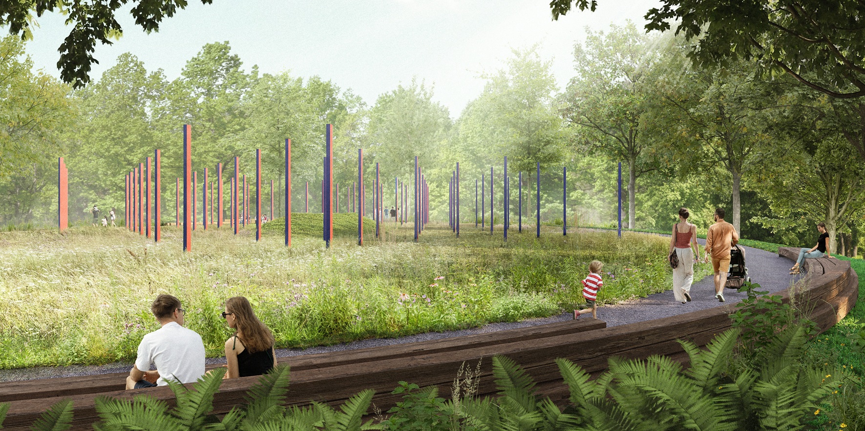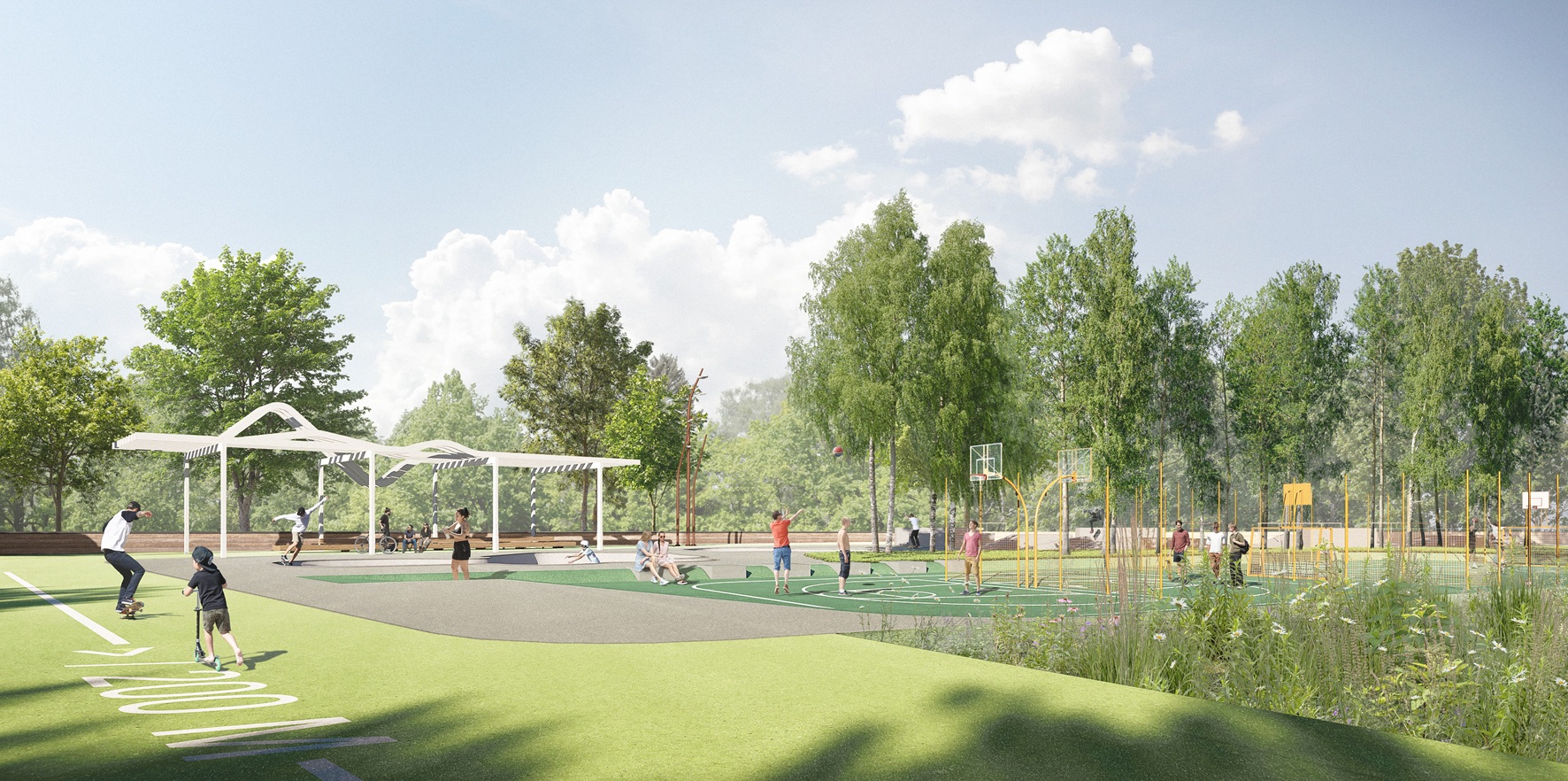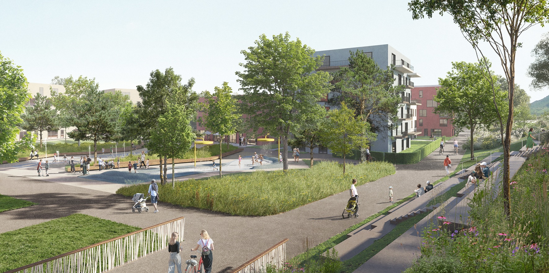 Der Entwurf von relais Landschaftsarchitekten Heck Mommsen PartGmbB überzeugt durch einen klaren Konzeptansatz, der die Leitidee der Zirkularität und Nachhaltigkeit konsequent umsetzt: Minimalinvasive Eingriffe in Natur und Topografie, sensible Grünflächengestaltung und dauerhafte Nachnutzung mit langlebigen Sport- und Bewegungsflächen, Spiel- und Aufenthaltszonen. Circular Labs („Follys“) sind geplant, modulare Pavillons aus nachhaltigen Materialien, die Umweltbildung, Ernährung und Zukunftsthemen erlebbar machen. Integriertes Regenwassermanagement wird mittels landschaftlich gestalteter Versickerungsmulden ermöglicht. Die Gesamtwirkung ist identitätsstiftend, klimatisch resilient, familienfreundlich und stadtgesellschaftlich anschlussfähig.