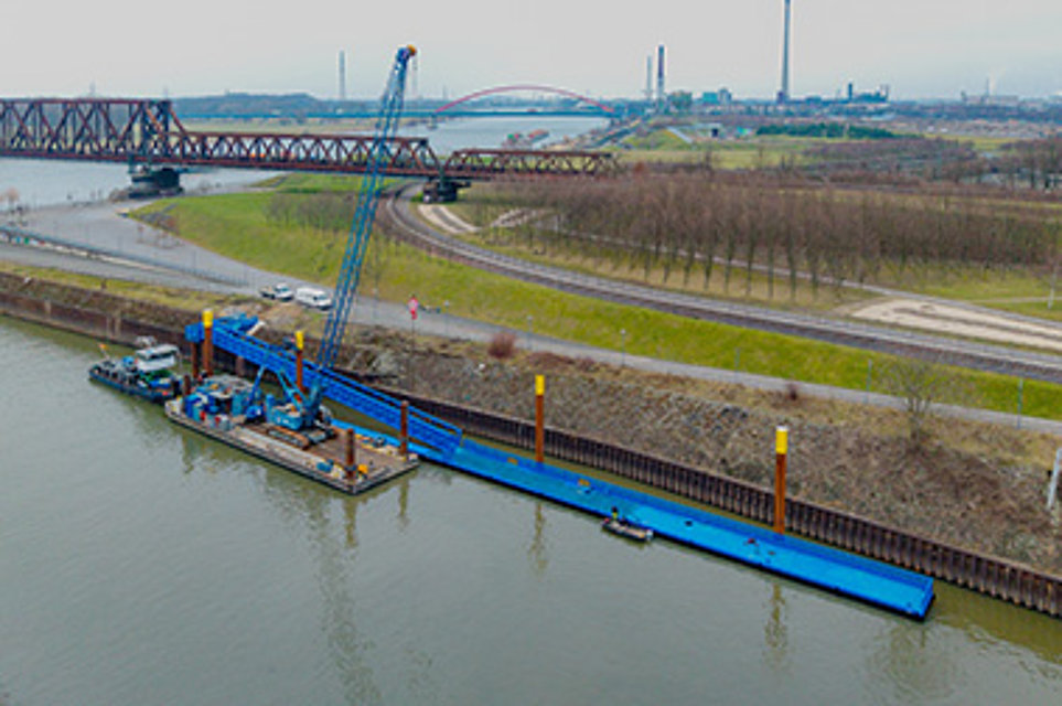Im RheinPark Duisburg ist ein weiterer bedeutender Meilenstein erreicht, teilen IGA Ruhrgebiet 2027 und die Wirtschaftsbetriebe Duisburg in einer gemeinsamen Pressemitteilung mit. Der neue Schiffsanleger wurde erfolgreich installiert. Mit dem rund 72 Meter langen und 70 Tonnen schweren Schwimmponton stärkt die Stadt Duisburg ihre Infrastruktur am Rhein und baut ihre Position als touristischer Standort weiter aus. Der Anleger verfügt über eine 45 Meter lange Gangway, die sich flexibel an wechselnde Wasserstände anpasst. Schiffe mit einer Länge von bis zu 80 Metern können hier künftig längsseits festmachen. Damit erhält der RheinPark eine zusätzliche, attraktive Anbindung vom Wasser aus. Gefertigt wurden die Pontonteile von der Firma SBS Andernach GmbH im Auftrag von duisport. Der Transport nach Duisburg erfolgte per Schiff, anschließend wurden die Elemente vor Ort montiert.