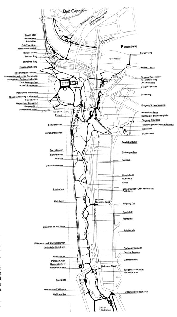 Im Süden der neuangelegten Parkanlage entstand der Paradiesweg, in dessen Verlauf ganz unterschiedliche Gartentypen vorgestellt wurden. Innovativ: Auch ein Unkrautgarten war dabei. Wie schon bei der ersten Stuttgarter Gartenschau wurden Fußgängerverbindungen geschaffen – zehn neue Übergänge wurden errichtet, um das Gartenschaugelände fußgängerfreundlich mit den angrenzenden Stadtteilen zu verbinden.